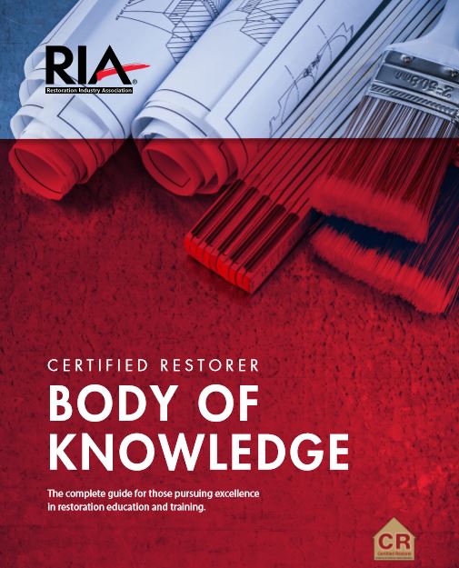 The RIA Certified Restorer Body of Knowledge is a trailblazing document for the restoration industry. Available free to the industry from RIA, this document is intended to provide an update on the changing and expanding restoration industry. It is organized to cover primary knowledge sections that follow core competencies and levels of understanding. Also conveyed are how elements of the restoration profession are interrelated, enabling the Certified Restorer to succeed.