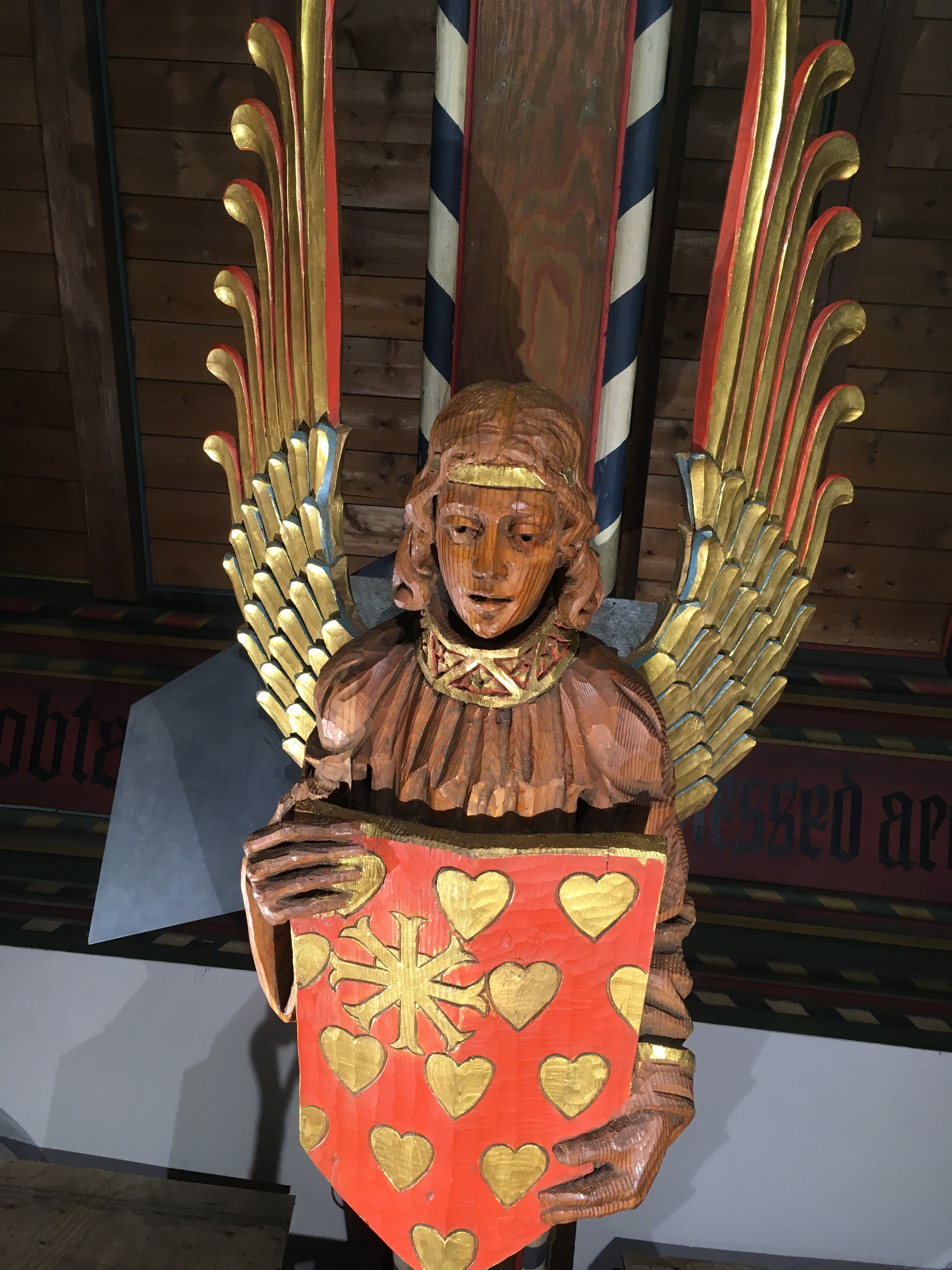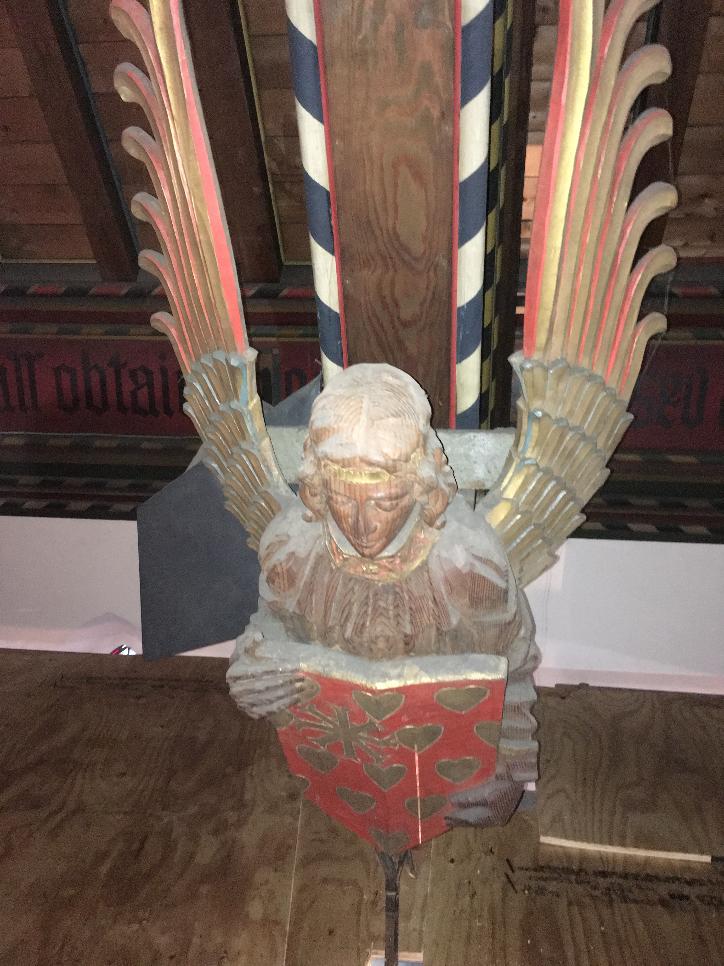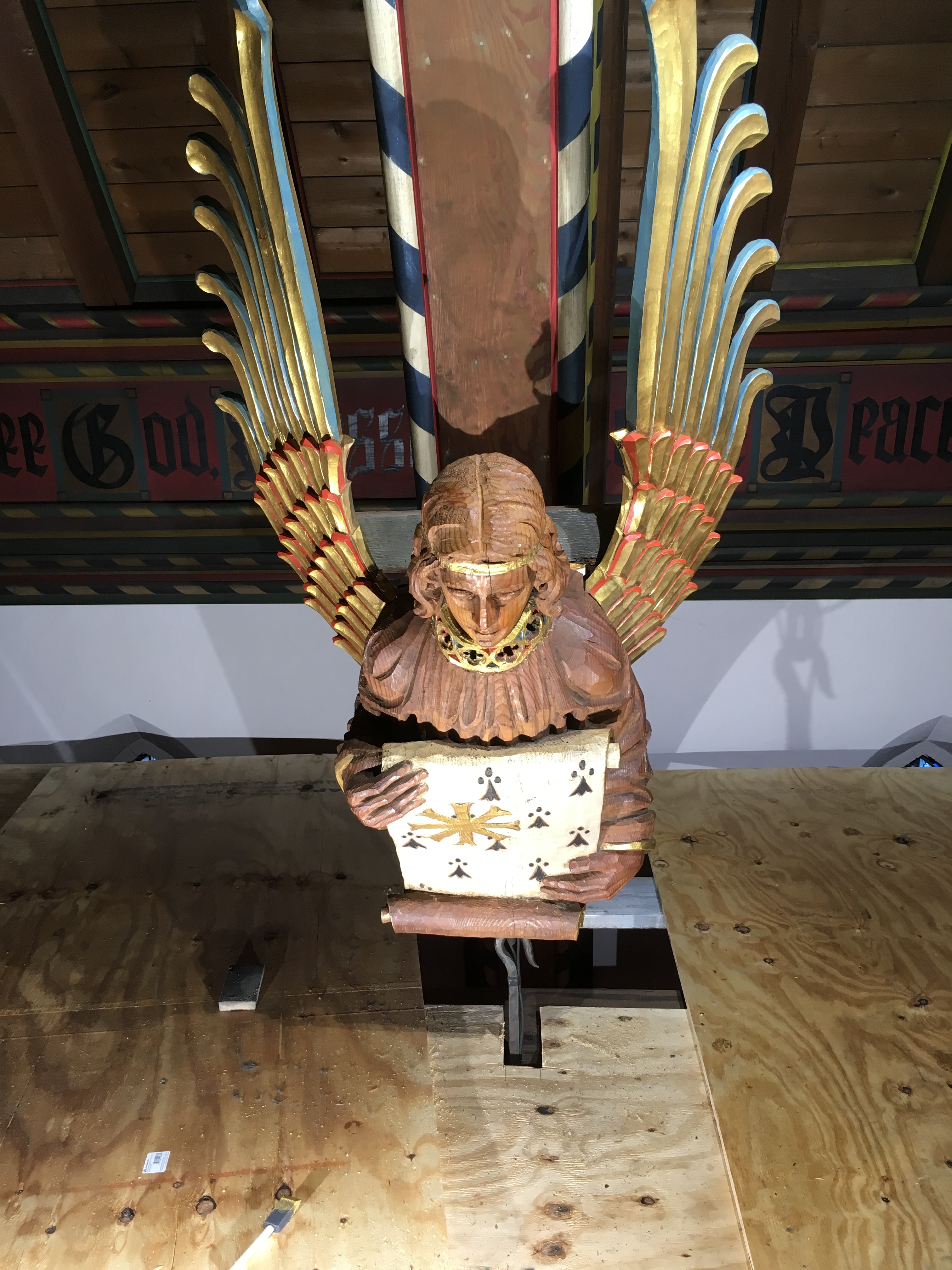 Before, during and after cleaning: The church’s angels were cleaned and touched up with gold leaf paint to give a beautiful glow off the lighting below them.