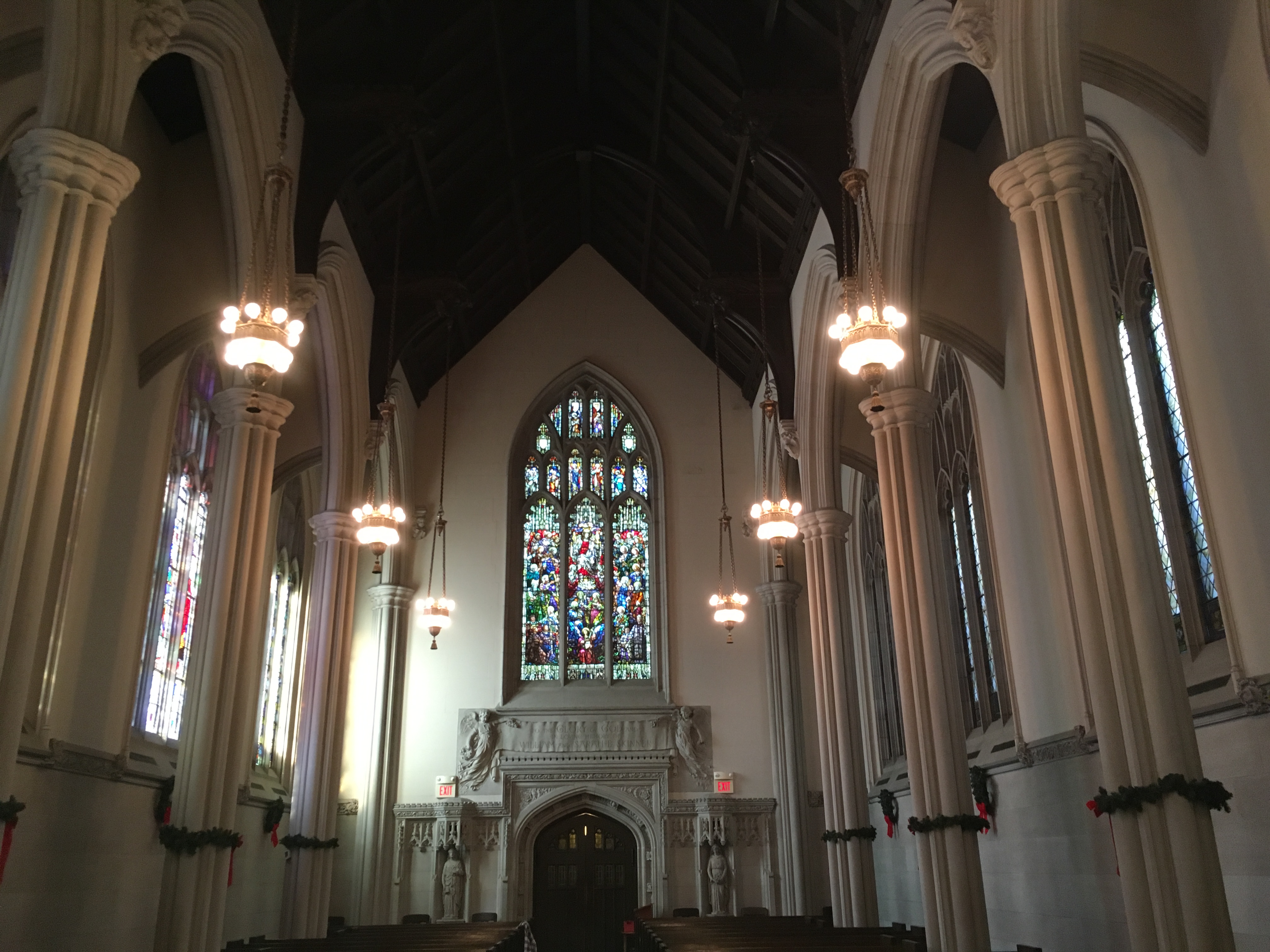 The chapel consisted of a 42-foot-high cathedral ceiling, granite walls, marble flooring and a mosaic marble tile design on the main altar. At the rear of the altar was another higher altar that would house choirs during church services. On either side of the altar were the components for the 100-year-old pipe organ, which has been valued at well over $1 million. Intricate stone statues adorned the perimeter of the altar as well as the front and rear portions of the sanctuary. On either side of the chapel were panels of elaborate stained glass windows. The cathedral ceiling is built of solid oak and canvas panels from front to rear. Over 20 chandeliers, with 16 lights on each, hung from an angle perched above at the base of the ceiling. Sixty 22-foot-long pews also were in need of cleaning and restoration, including all the hymnals and books.