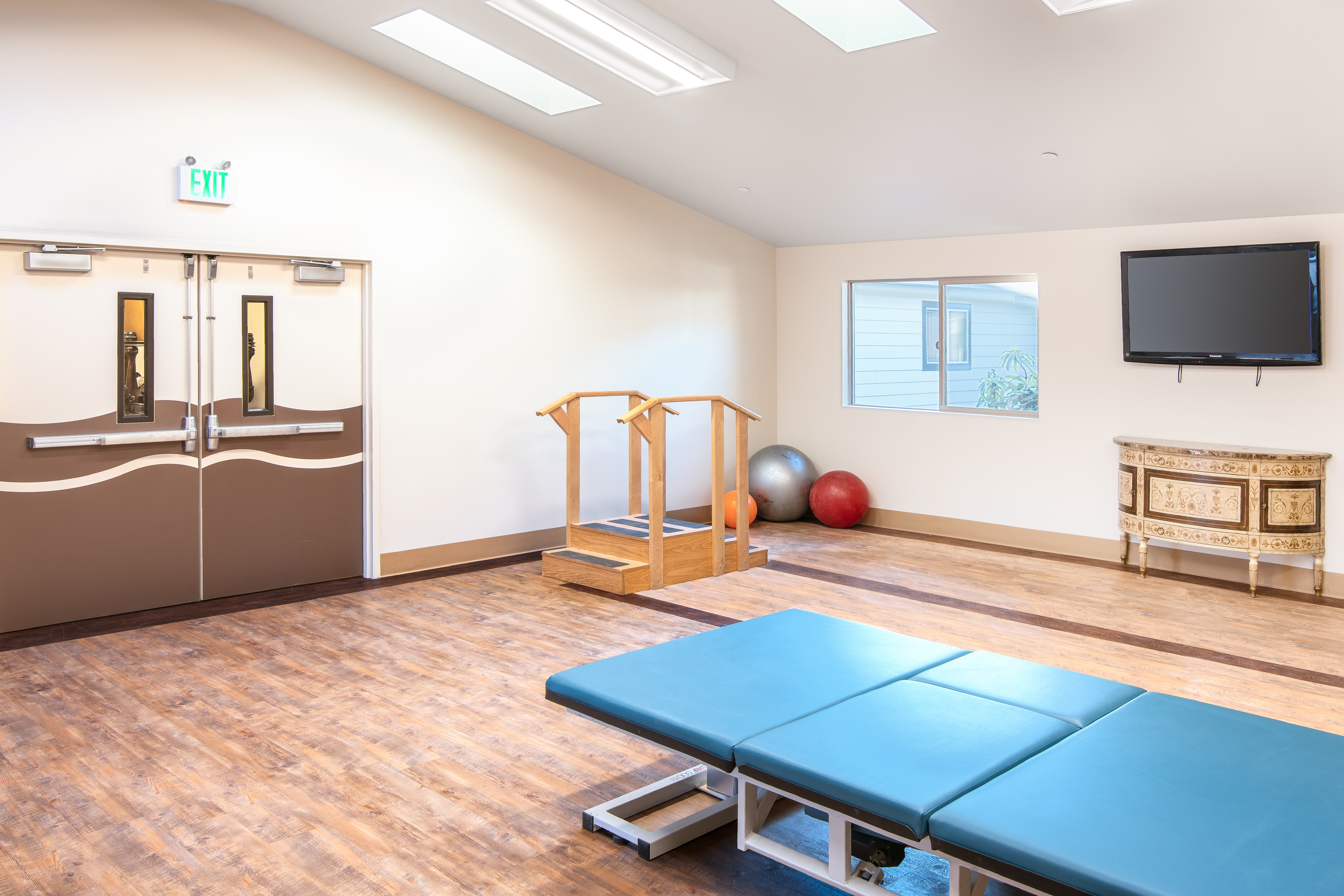 (Above) The physical therapy gym prior to remodel, showing the existing flat ceiling to be replaced with a new gabled roof structure. (Below) The physical therapy gym after remodel, including a new Occupational Therapy Kitchen, bathroom and shower for patient rehabilitation. The French doors lead to a new raised outdoor deck installed by Charter.