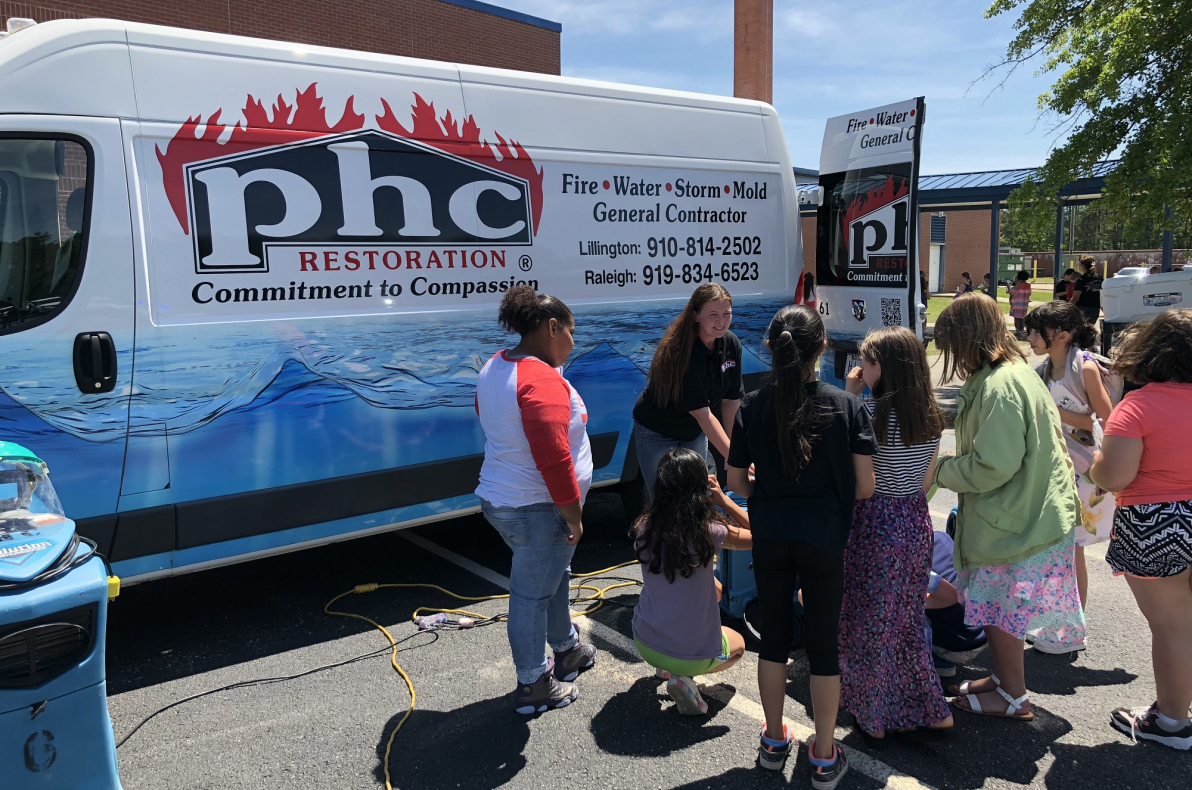 PHC Restoration participated in South Harnett Elementary School’s Career Day events in 2018 to help students explore a career in restoration, spread the word about the dynamic work restoration professionals do and potentially spark the interest of future professionals. CEO Katie Smith says, “We believe that children need to know there are alternatives to the traditional college path. We hear adults tell us all the time that they never knew this industry existed until they needed our services. We want to change that. We believe kids need to see the honor and satisfaction that comes from helping others and restoring something with your hands.”